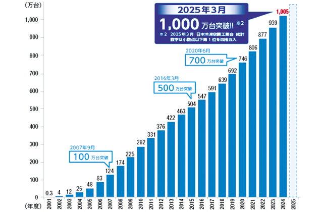 エコキュートはこの省エネ性能により普及し、24年度末には国内累計販売台数が1000万台を突破。近年は普及の勢いが加速し、500万台を突破して、わずか8年で1000万台に到達した。これに寄与しているのが「おひさまエコキュート」と太陽光発電の組み合わせだ。