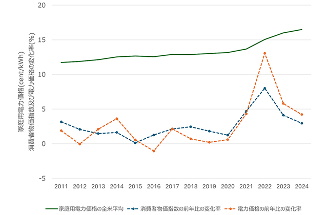 米国の電力小売価格は電力需要の増加に伴い上昇基調を強めている。