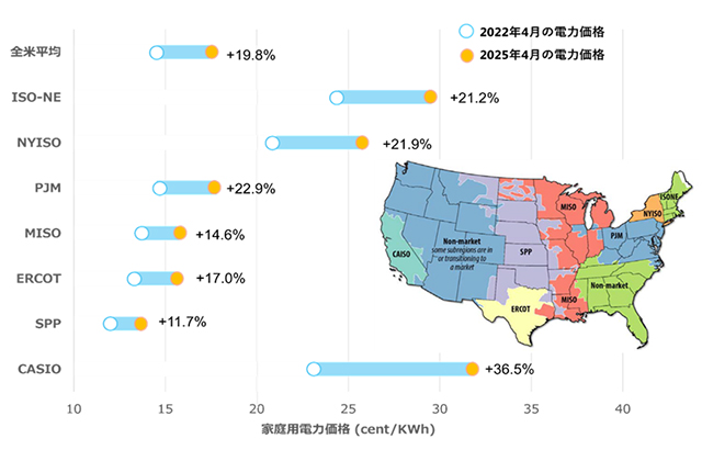 需要増を受け、米国の電力小売価格は上昇基調にある。図1に示す通り、消費者物価指数に基づく電力価格の前年比は22年以降、インフレ率を上回る水準で推移し、EIAは25年の家庭用電力価格が全米平均で1kW時当たり17・25セントに達すると予測している。米国の電力システムは連邦エネルギー規制委員会(FERC)によって発令された 「Order No.888」および「No.2000」を経て整備された七つのRTO(地域送電機関)/ISO(独立系統運用者)が北米の約3分の2を運用しており、地域別の価格動向には差がある。