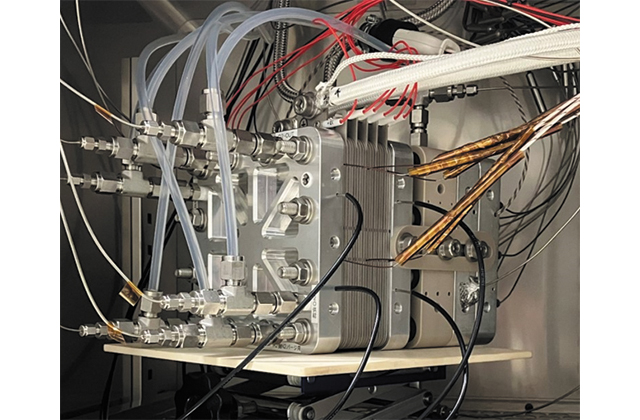 吉崎 当社は新エネルギー・産業技術総合開発機構(NEDO)の「グリーンイノベーション基金事業」の助成を受け、ハイブリッドサバティエなど革新的メタネーション技術の開発に取り組んでいます。ハイブリッドサバティエは、サバティエ反応によって生じた熱を水電解に有効活用し、システム全体の効率向上を目指す技術です。触媒などの要素技術開発やデバイス構造の最適化を経て、24年度にはグリーンイノベーション基金事業のステージゲート目標であるエネルギー変換効率75%以上を達成しました。