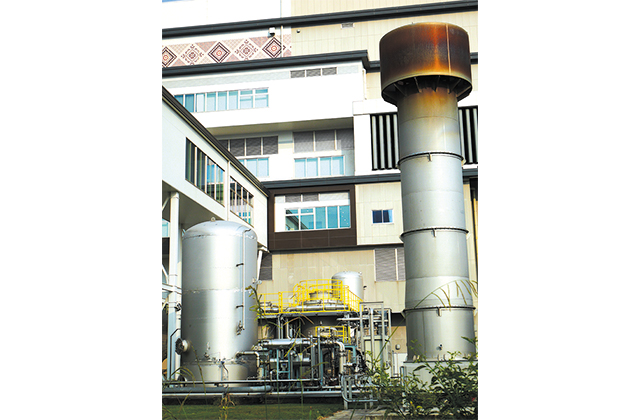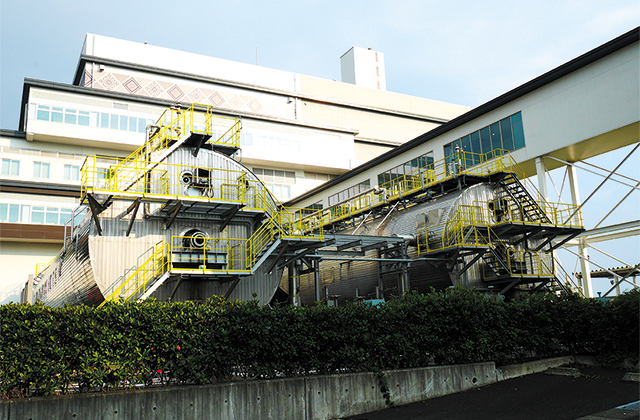 清掃工場の敷地に足を踏み入れると、まず目を引くのが2基の巨大な円柱形の「発酵槽」だ。1日の処理能力は計約60t。外から中の様子を見ることはできないが、投入されたごみは、全長約40mの槽内を16日間かけてゆっくりと通過していくとのこと。発酵に適した55℃に保たれた槽内には、工場稼働に先立つこと4年前に「メタン生成菌」と呼ばれる微生物が入れられ、これが、ごみを分解しガスを発生させる役割を担っている。