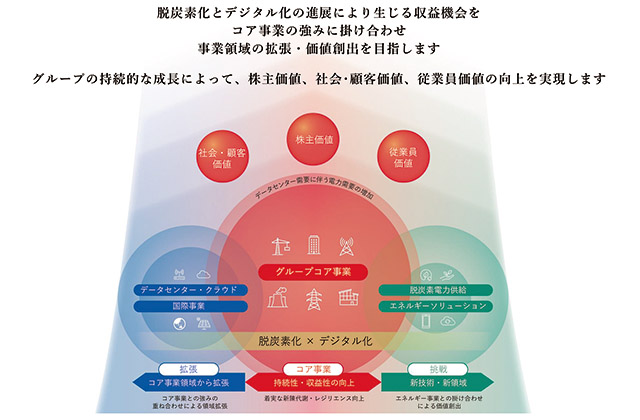 しかしながら現在は、「脱炭素化」と「デジタル化」の進展によって、低・脱炭素電力に対するお客さまや地域の皆さまからの新たなニーズが拡大するとともに、将来の電力需要が増加する可能性が生じるなど、新たなチャンスが生じています。新中計では、エネルギー事業と情報通信事業を通じて培ってきた強みを生かすことで、グループとしての成長を目指す姿を描くことができました。