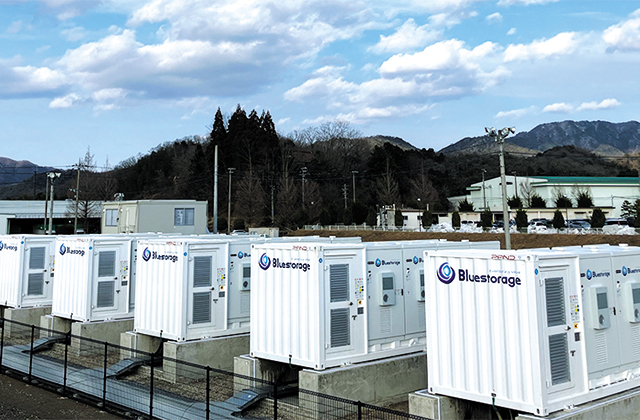 特徴の一つが、メーカーとしてのポジションによる事業展開だ。中国の電気自動車(EV)大手BYD、蓄電池ベンチャーのパワーエックス(岡山県玉野市)と提携し、OEMで自社ブランドの蓄電システム「Bluestorage(ブルーストレージ)」を販売している。工場などに設置する産業用をはじめ、系統用蓄電池や太陽光発電サイトなどに併設する蓄電池をラインアップした。