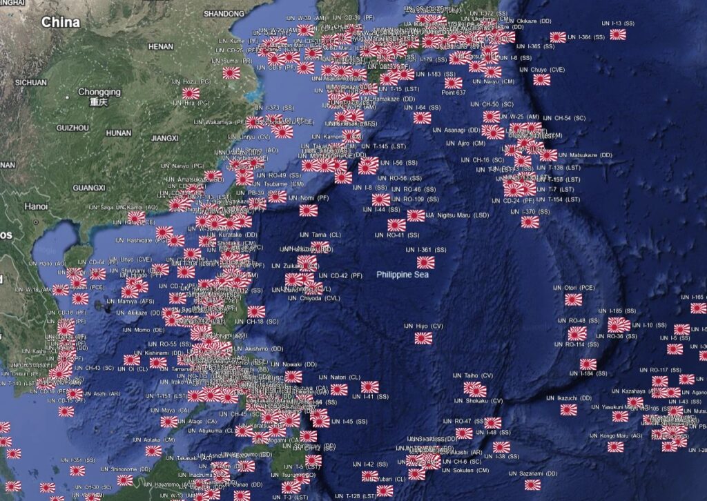 一つの印象的な画像がある。第二次世界大戦における日本海軍の軍艦の沈没地点をGoogleマップで記録し、可視化したものだ。米国の戦史マニアが作ったようだが、今はそのサイトは消えている。